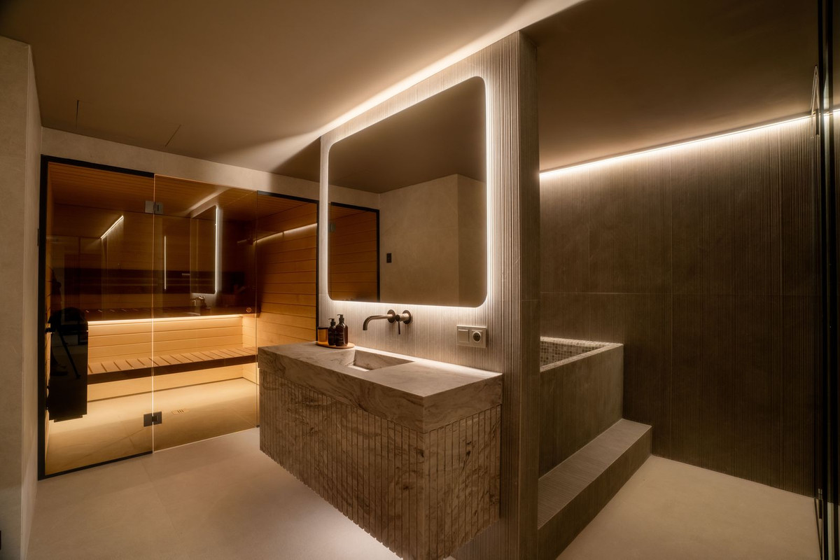 On the lower level, the home transforms into a full-scale entertainment and wellness retreat, complete with a custom bar and lounge, a private cinema room, and a dedicated spa area featuring a traditional hammam, Finnish sauna, plunge bath, and dual rain showers — bringing the full luxury experience into your everyday life.