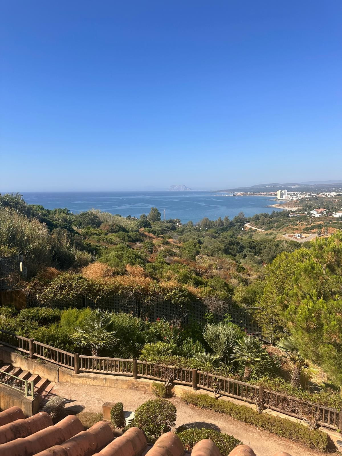 Stueplan: moderne køkken/stue i åben planløsning, soveværelse med eget badeværelse og adgang til en stor terrasse med panoramisk udsigt over Middelhavet og Gibraltar.