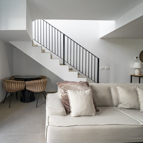 On the ground floor, you will find a spacious lounge with a cosy dining area alongside with direct access to the terrace. The dining area is connected to the open kitchen which offers the laundry room and separate toilet behind it. On the first floor you have 2 beautifully decorated spacious bedrooms en suite with access to the first-floor terrace and panoramic sea views. On the min 1 there are 2 more spacious bedrooms with a shared bathroom.