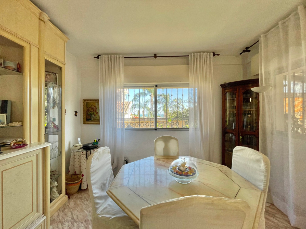 The property offers 115 m² distributed over three spacious bedrooms with fitted wardrobes, three full bathrooms (one external, next to the pool), a bright living room with a fireplace and access to the garden, and a separate kitchen with access to a private patio.