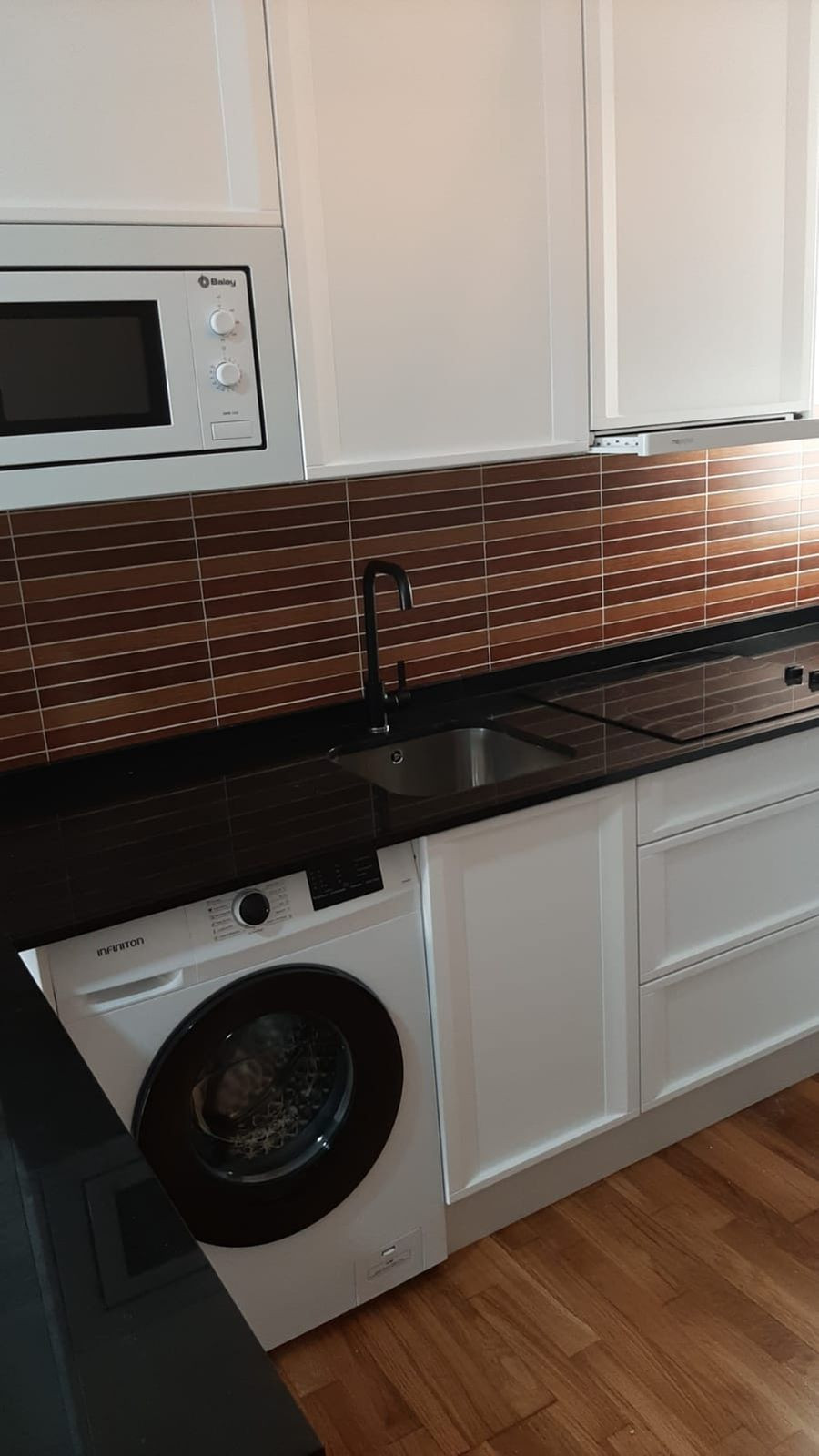 A modern kitchen with integrated appliances and sleek finishes.