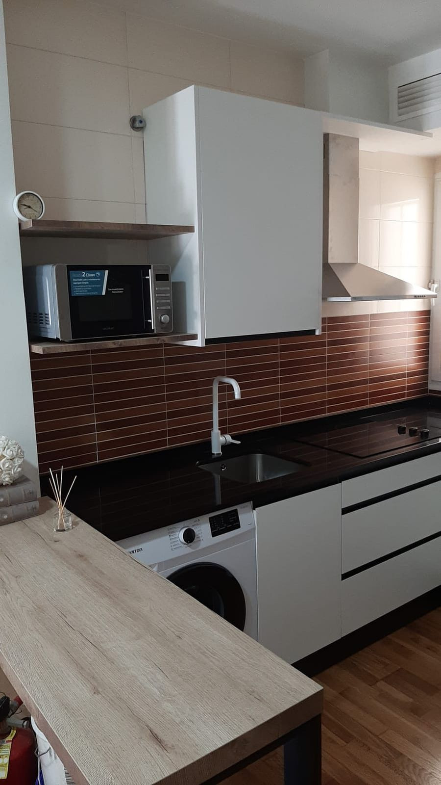 A modern kitchen with integrated appliances and sleek finishes.