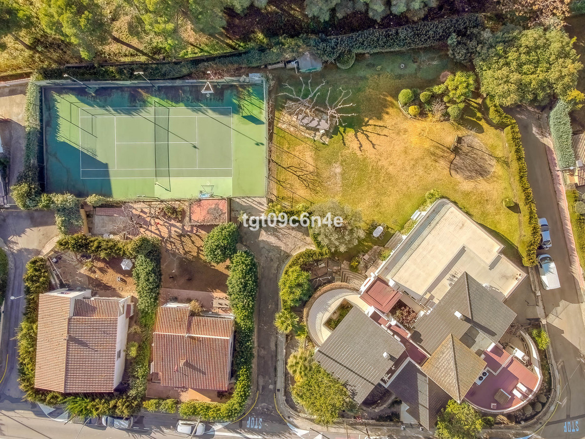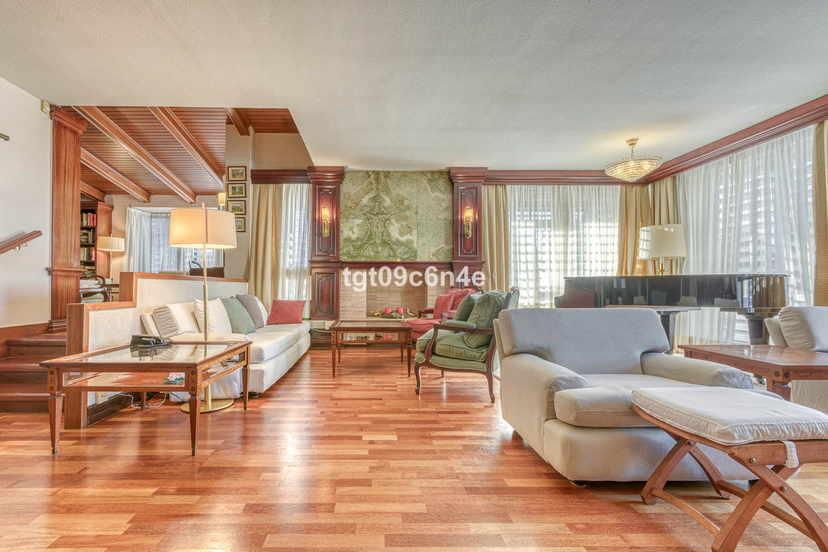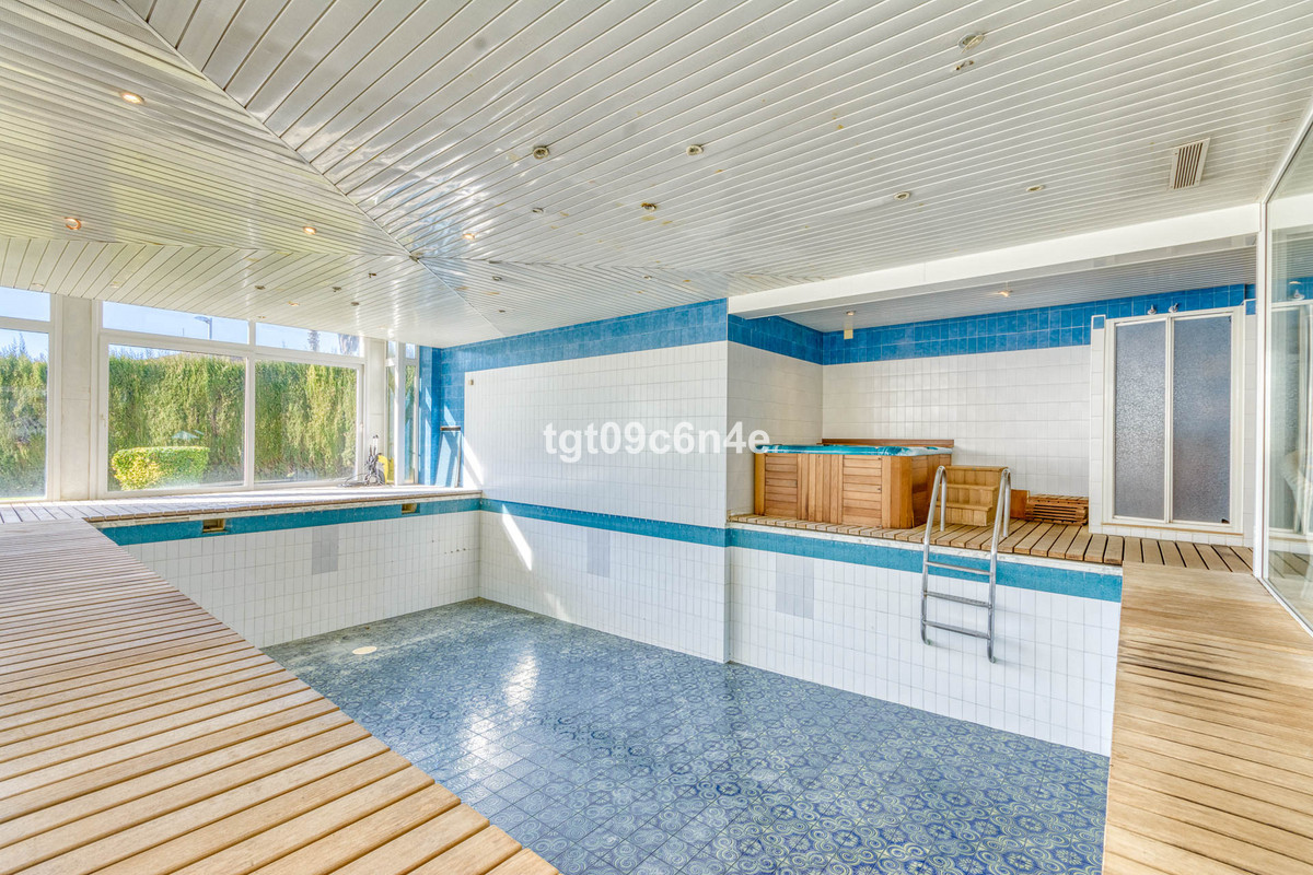 The entrance to the house is located on the main (intermediate) floor, while the lower floor has direct access to the garden. Here we find the large leisure area. Indoor heated pool (purified with chlorine), with marble edges covered with wooden flooring; sauna, jacuzzi and shower area; very spacious dining room with floor-to-ceiling windows overlooking the garden; auxiliary or summer kitchen, allowing us to spend the whole day on this floor.