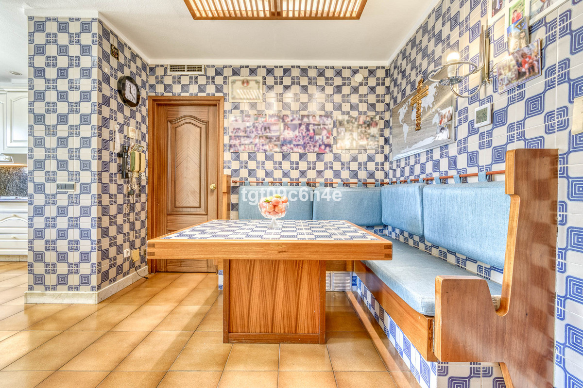 From the living room we access the separate dining room and from here, the kitchen, traditional and cozy, with wooden furniture.