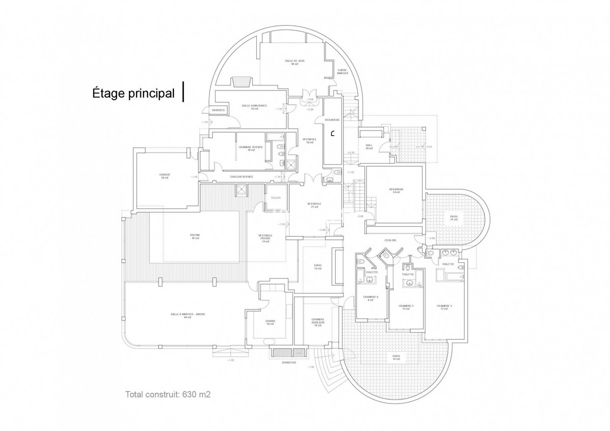 Large service area, with: wine cellar, laundry, luggage room, machine room, a small storage room, two toilets and an en-suite bedroom for service personnel. From here we access the garage for two cars.