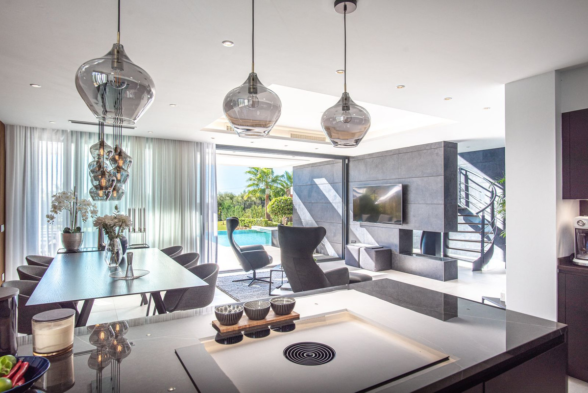 This 6-bedroom, 5-bathroom villa sits on a generous plot of over 1,000 m² with a built area of 383 m², plus an additional 150 m² of terraces. Enter through impressive iron doors into a spacious and bright living room, beautifully designed with bespoke interiors and floor-to-ceiling windows that flood the home with natural light.