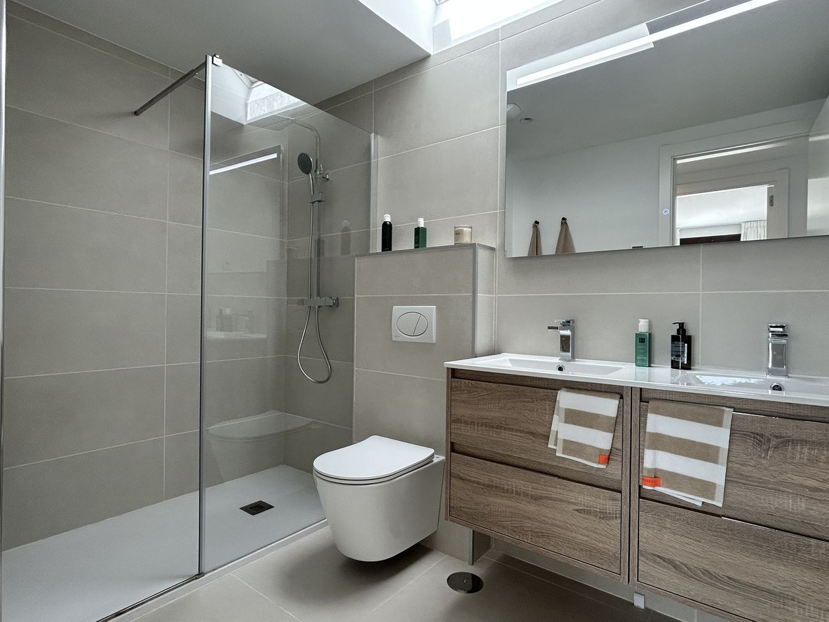 The living room and kitchen share an open space that extends onto the spacious terrace through large, high-performance sliding windows, creating a seamless connection between the interior and exterior. Its features include an air-source heat pump system for heating and cooling, underfloor heating in bathrooms, aluminum/PVC exterior carpentry with double thermoacoustic and security glazing, and pre-installed motorized blinds in the bedrooms and living room.
