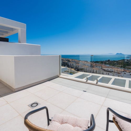 This exceptional residence offers three double bedrooms, a spacious south-facing terrace, and an expansive rooftop solarium with panoramic views of the sea, mountains, Gibraltar, and Morocco.
