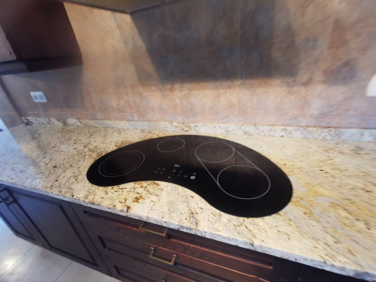 ▪️High-end fitted kitchen with integrated electric oven and hob, fridge-freezer, solid wood dining table and doors to the garden