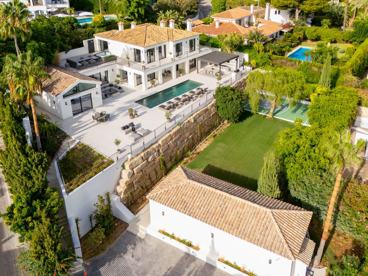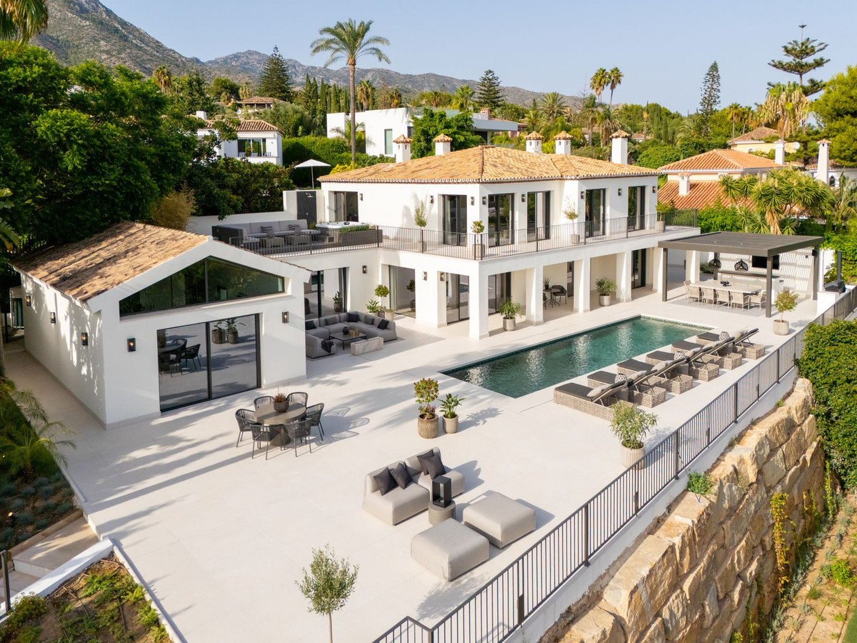 This fully renovated Andalusian-style villa is set in Rocío de Nagüeles, one of the most prestigious enclaves of Marbella's Golden Mile. Positioned on a 1,965m² south-facing plot beneath the emblematic La Concha mountain, it captures sweeping views of the Mediterranean. Modernised in 2025, the residence extends over 734m², where soaring ceilings, floor-to-ceiling glazing, and fluid indoor-outdoor transitions highlight its luminous design.