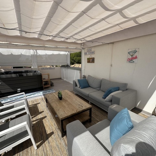 The apartment, located on the third floor with an elevator, is completely exterior and has large windows, including in the kitchen and bathroom, providing plenty of light even on the cloudiest days. Its magnificent orientation allows you to enjoy the outdoor areas both in summer and winter. The exterior is equipped with five awnings (three in the front and two in back) that provide magnificent shade, necessary on warm summer days. The rear terrace has indirect lighting (outdoor spotlights) and automatic watering equipment for plants, even reaching the pots in the kitchen window. Inside, the home also features hot/cold air conditioning and an Air Zone device to independently control the temperature of each room. The flooring is marble, and the windows are double-glazed aluminium.