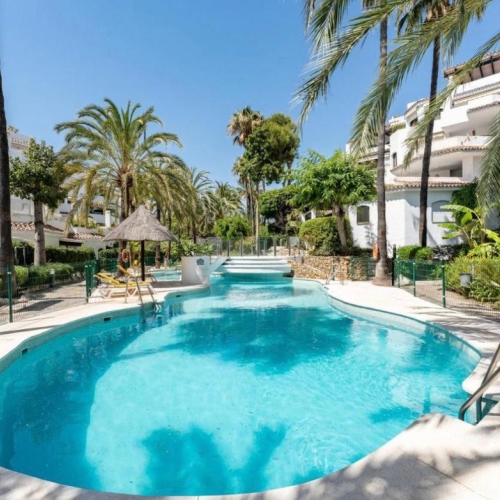 Beautiful property for sale in perfect condition in the Elviria area, close to the golf course and less than a 5-minute drive to the beach! Quiet, very residential urbanisation, ideal for permanent residence. Duplex , is on the ground level but with hight , no lift or stairs, very comfortable!!! The property is on a corner, so it is very sunny and bright and has sun all day long! Very large terrace at the entrance of the house, with awnings and afternoon sun. Upon entering, we find a spacious living room with an open, fully equipped kitchen, from the living room access to the second terrace, which faces south and offers open views of the sea, with sun all day long! There are also new awnings!
