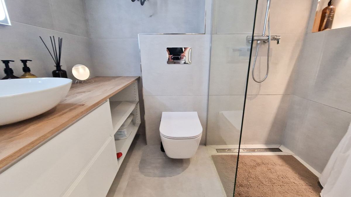 Luksuriøst badeværelse med effektiv udsugning, væghængt toilet og elegante materialer.