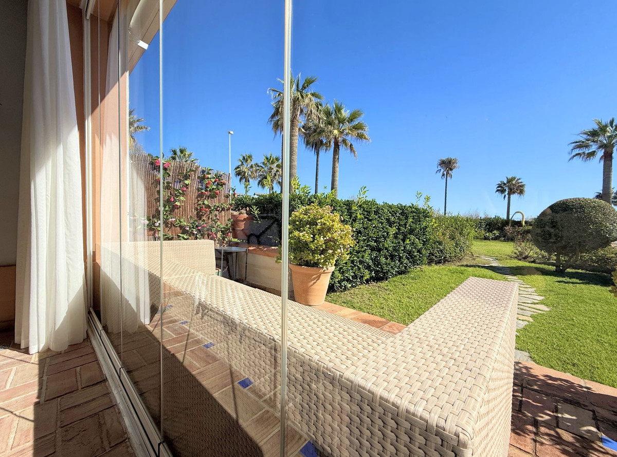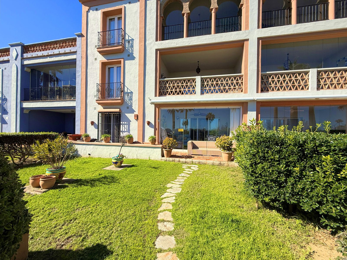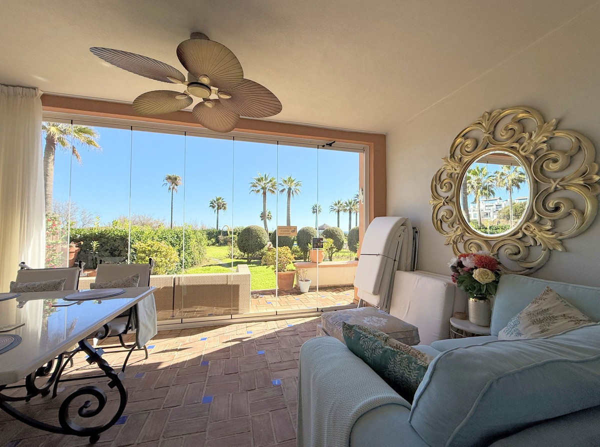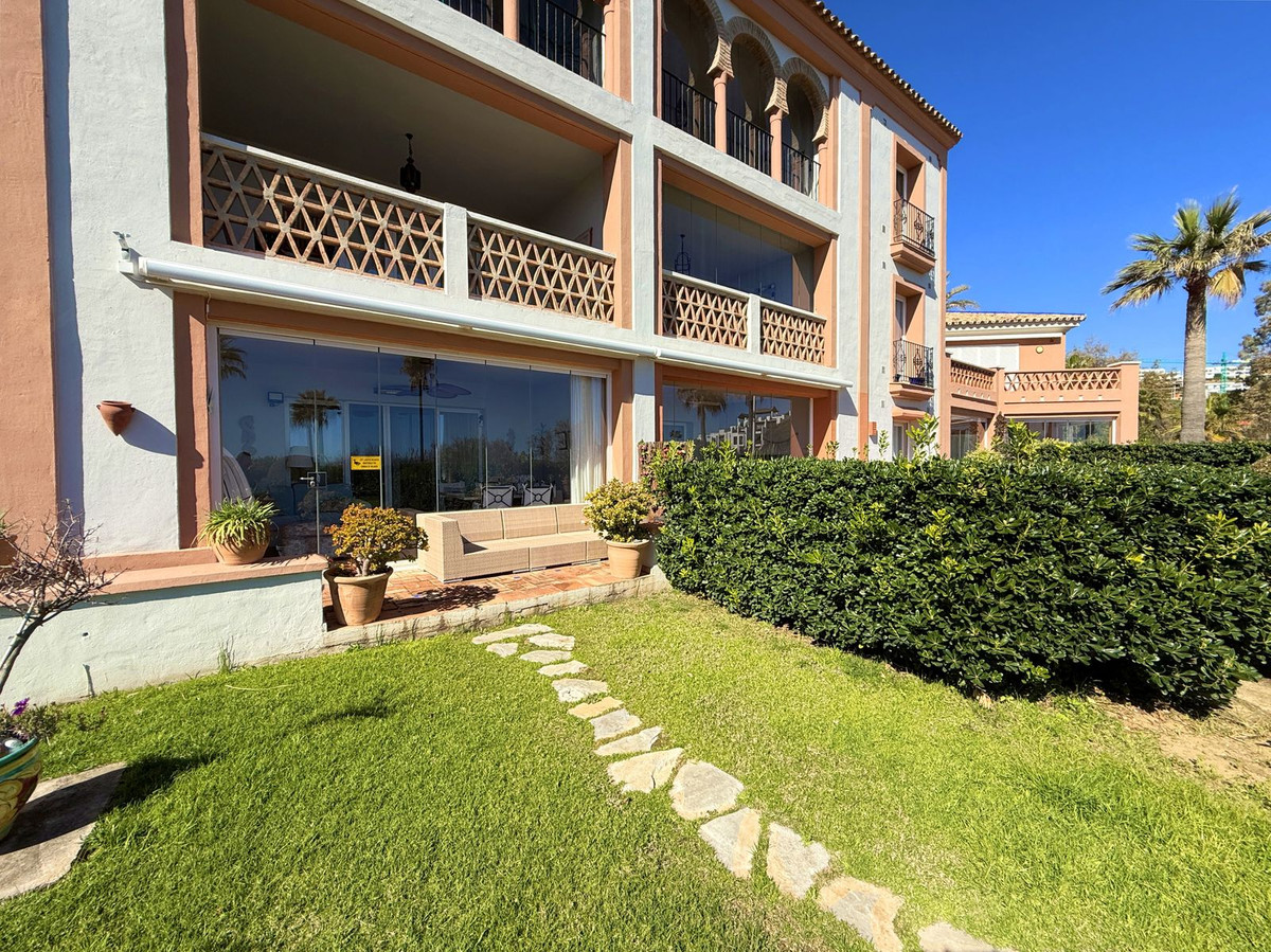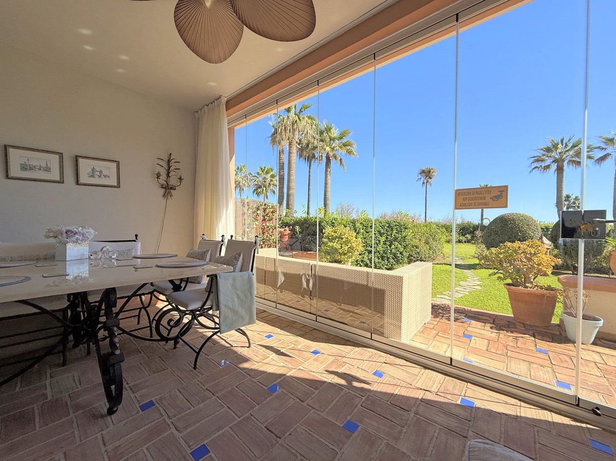 Magnificent apartment in a luxury complex on the beachfront, with a terrace and private garden, located in Casares Playa, within a prestigious development featuring a charming Moorish design inspired by the essence of Al-Andalus. Enjoy direct access to the promenade and the stunning local beaches, with a wide selection of restaurants, beach bars, and leisure areas. Situated in a privileged location between Estepona and Puerto de la Duquesa, just a five-minute drive from both, it offers the perfect combination of exclusivity, comfort, and Mediterranean lifestyle. Its south-facing orientation ensures abundant natural light throughout the day, creating a warm and welcoming atmosphere in every room. Recently renovated, the property stands out for its careful decoration and excellent condition, ready to move in. The kitchen, updated in 2023, features Siemens appliances, ivory-colored marble floors, and all windows fitted with mosquito screens. The apartment is all on one level, with two spacious and bright bedrooms designed for maximum comfort and rest. A cozy living-dining area with a fireplace opens onto the enclosed glass terrace overlooking the garden, the communal pool, and the beach. The development offers 24-hour security, ensuring peace of mind and privacy, as well as exclusive amenities such as two magnificent pools, one of them heated, allowing year-round enjoyment. The property also includes 2 underground parking spaces and 2 storage rooms, providing convenience and extra storage. Its strategic location makes it ideal as a permanent residence or an investment, with high potential for both holiday and long-term rentals. Close to prestigious golf courses, such as Finca Cortesín, as well as marinas, restaurants, and all necessary services, this property represents a unique opportunity. If you are looking for an exclusive apartment on the beachfront, with all the comforts in one of the most sought-after areas of the coast, don't miss this opportunity.