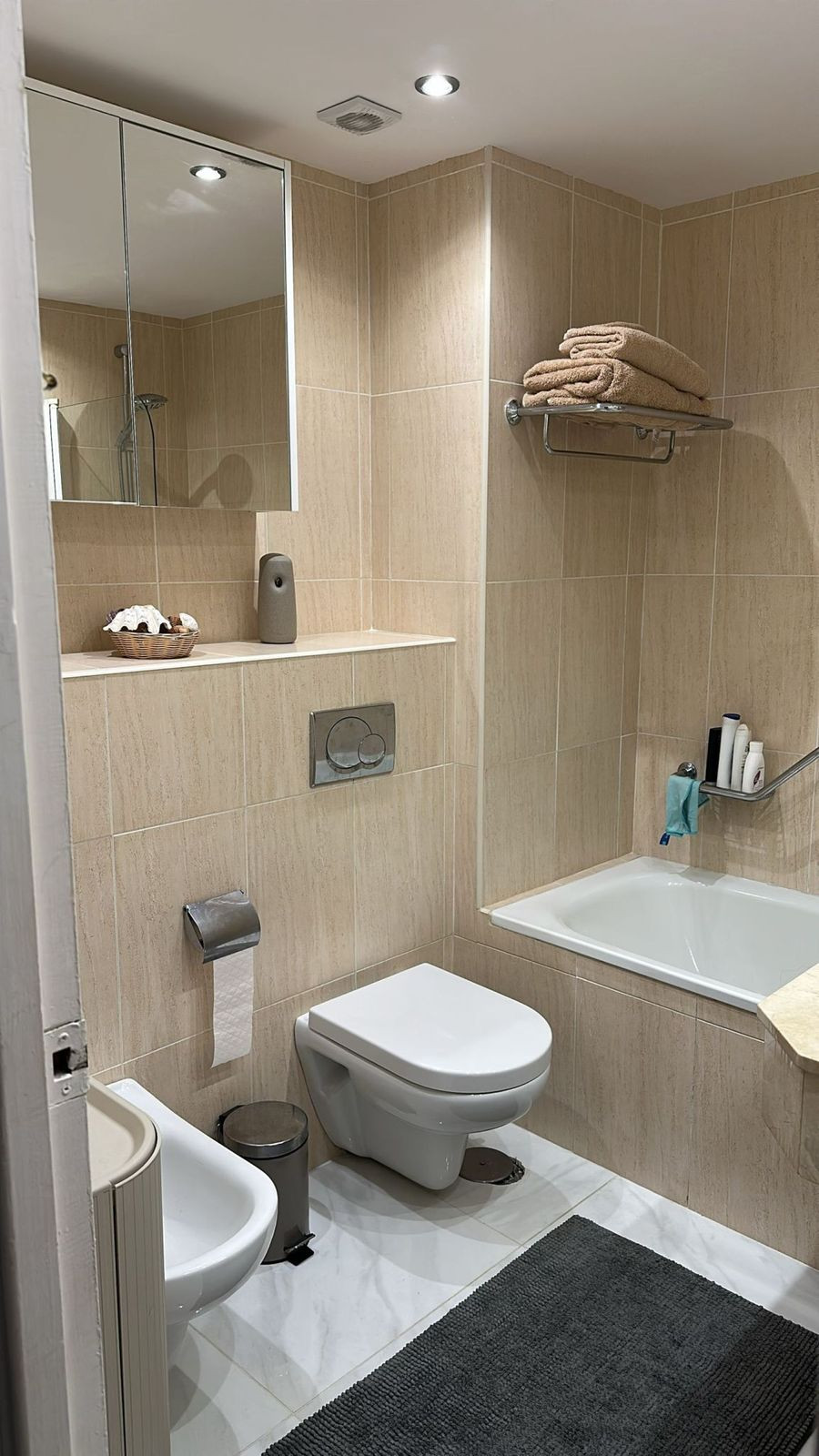 The apartment features two spacious double bedrooms with ample wardrobe space, and two contemporary bathrooms, one of which is en-suite. The open-plan living and dining area is filled with natural light, creating a warm and welcoming atmosphere. The fully equipped modern kitchen comes with quality appliances and plenty of storage, making it both functional and stylish.