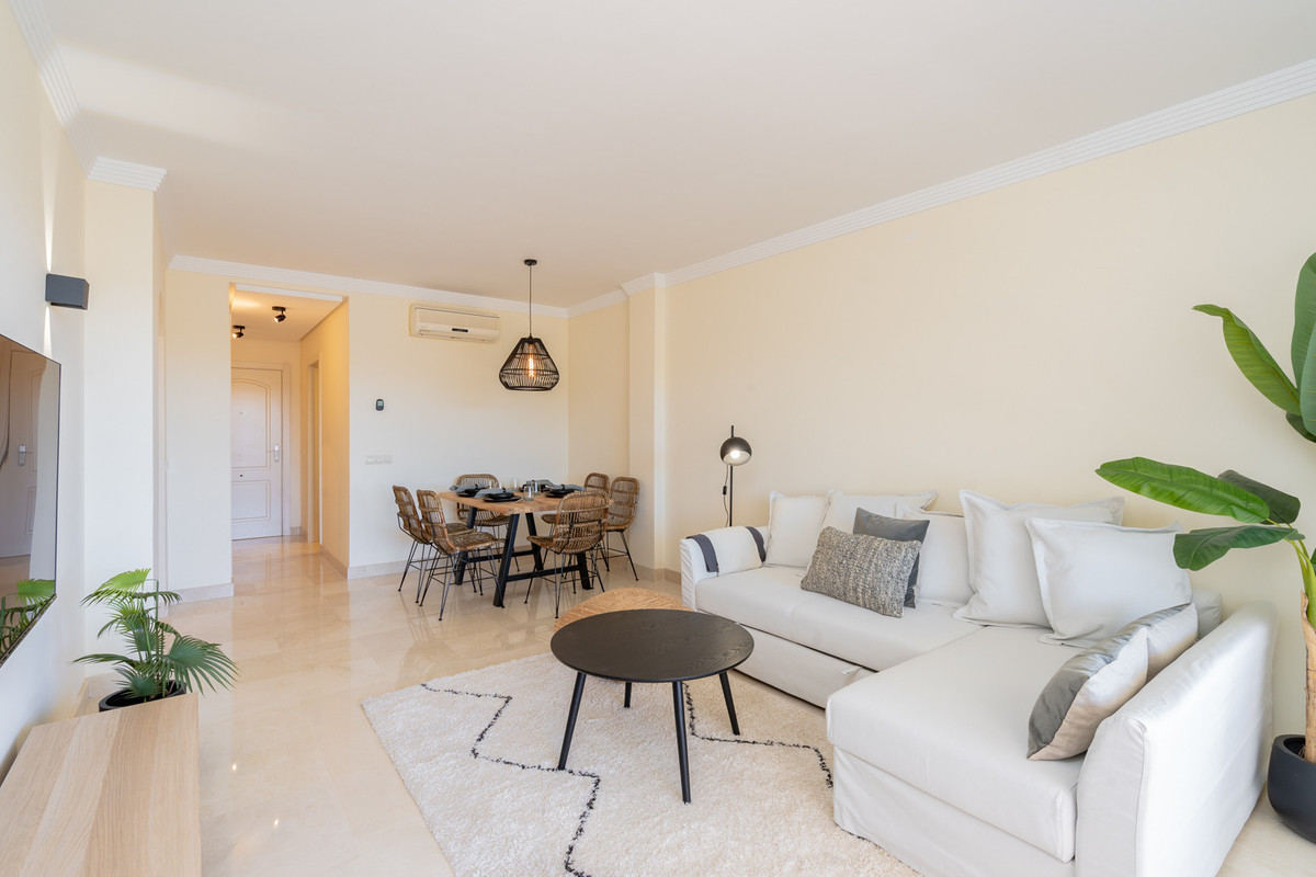 This bright and welcoming apartment offers 2 bedrooms and 2 bathrooms, set within a secure gated community featuring private parking, lift access, and beautifully maintained gardens. Large windows fill the home with natural light and open onto picturesque views of the mountains and the stunning organic-style communal swimming pool.