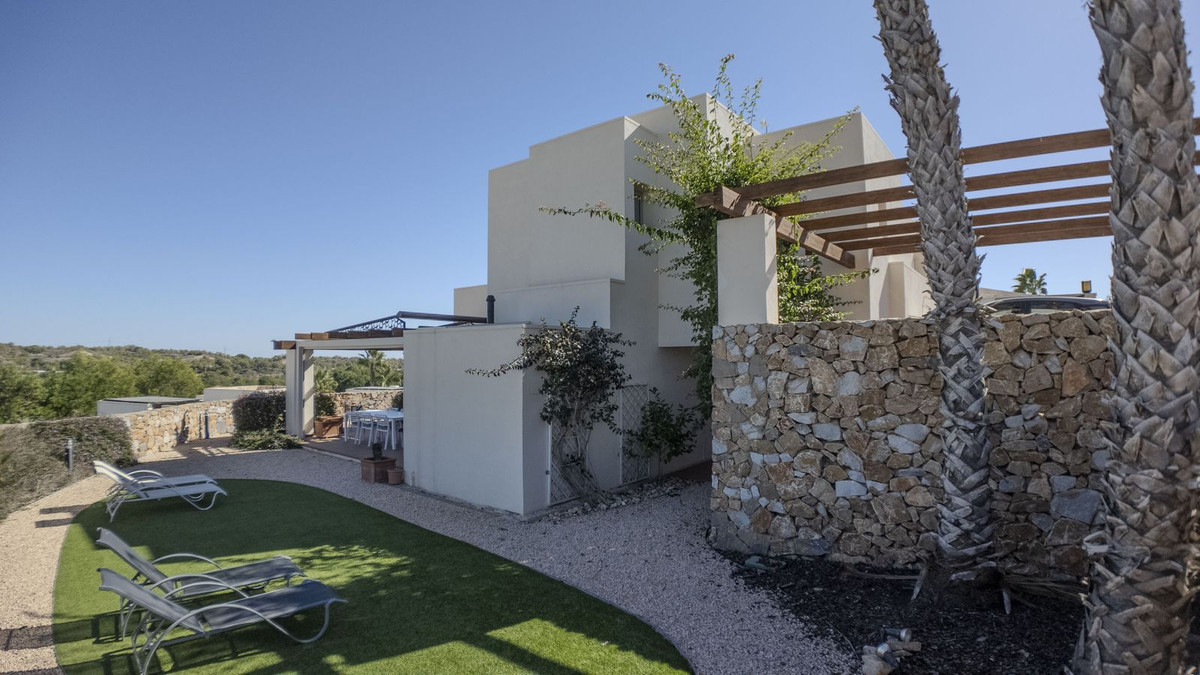 3 bed luxury villa in Las Colinas Golf for sale. This amazing villa is on the Jacaranda Estate in a gated community with private parking. The living room has a high vaulted ceiling with a dining area leading out onto a large outer garden area with an electric toldo covering a dining table for al fresco dining. The property features two private parking spaces. The house has a beautiful communal pool which is only shared with 4 villas, and space for a private pool if desired.