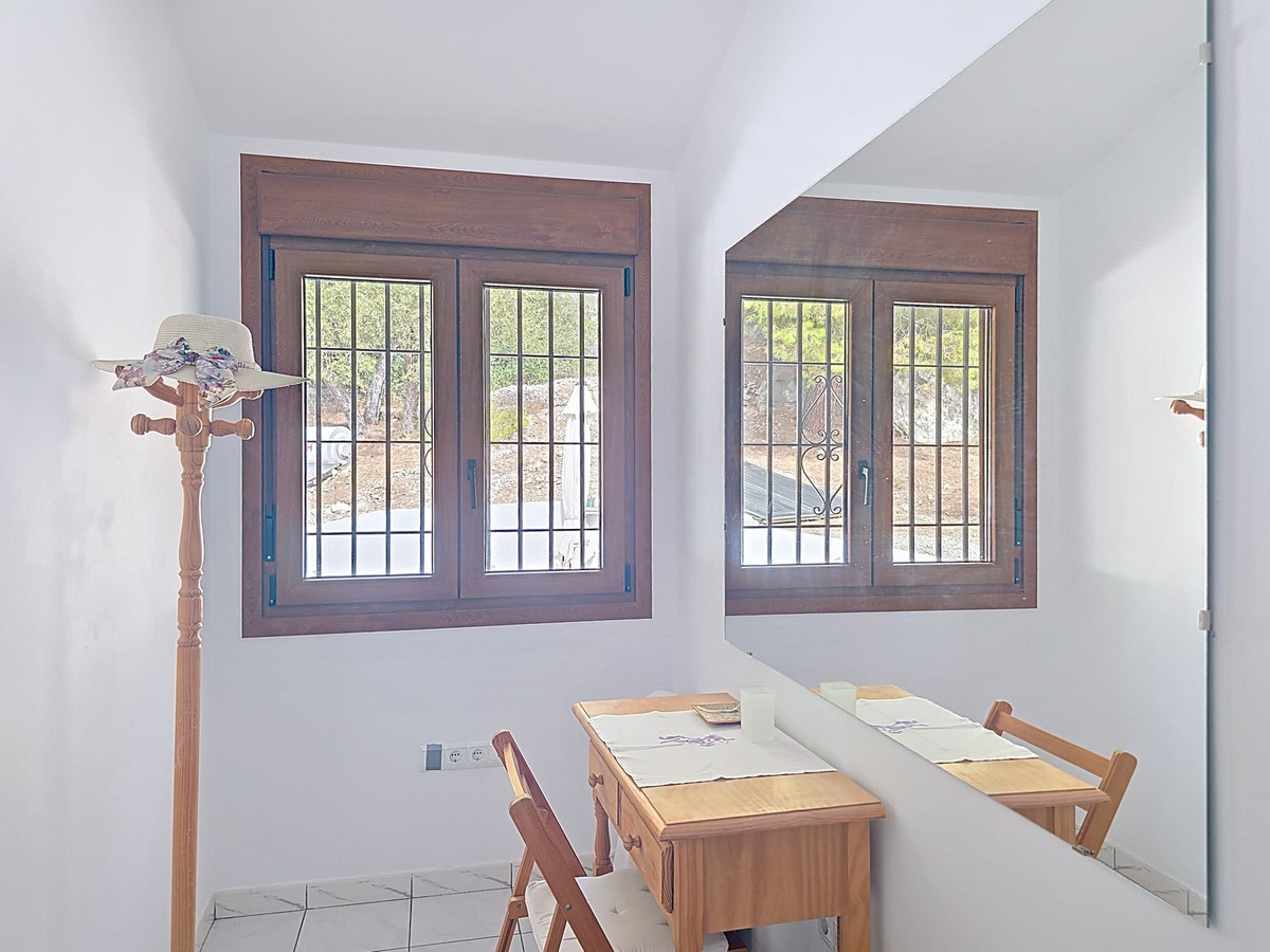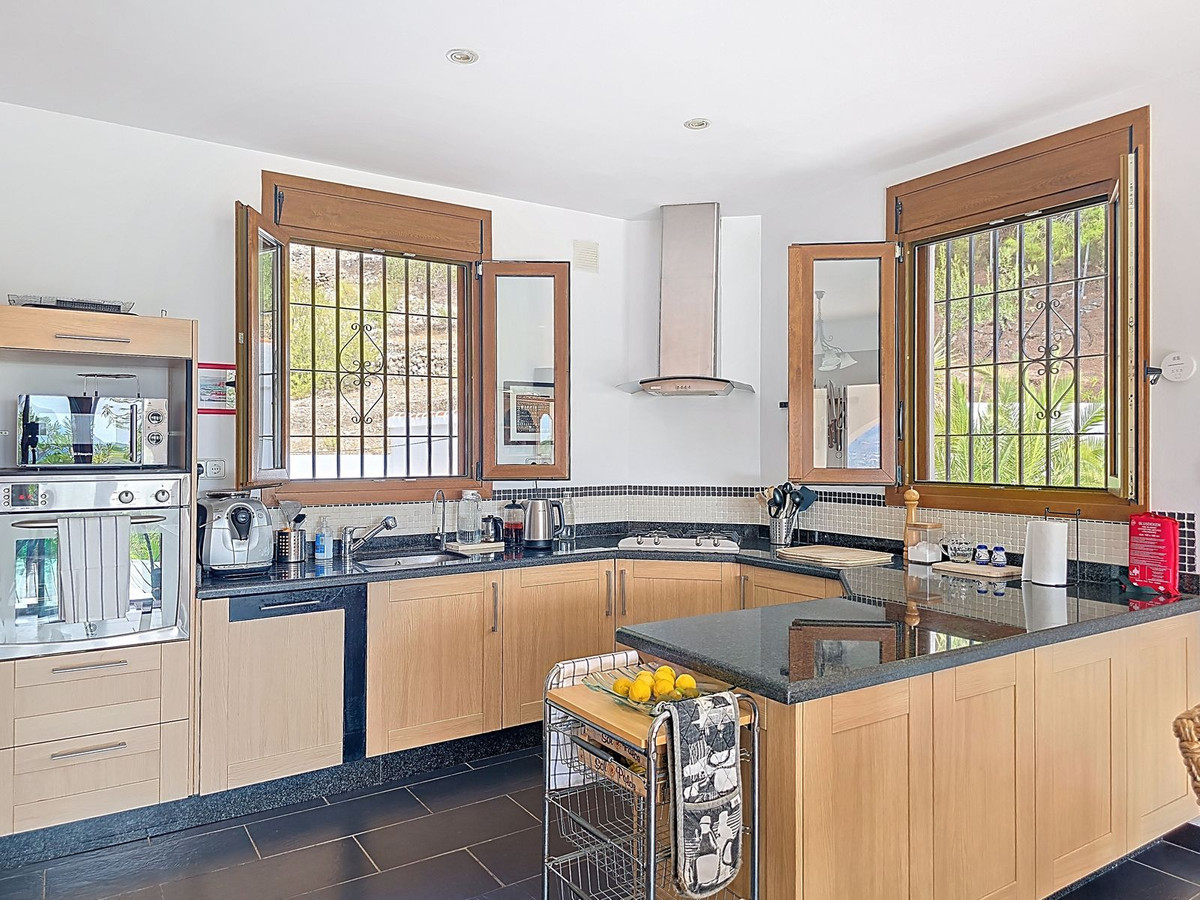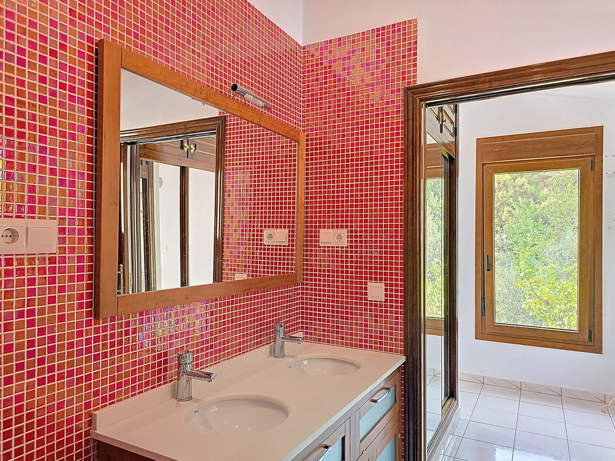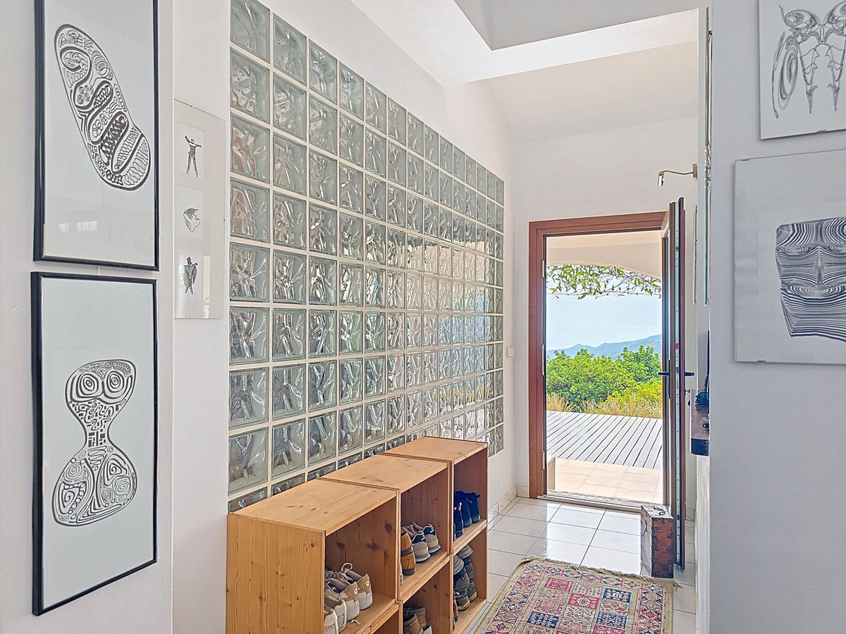 Udendørs finder du alt til den ultimative middelhavslivsstil: en smukt anlagt have, adskillige solrige terrasser, en opvarmet saltvandspool og en stilfuld bar med udendørskøkken – ideelt til lange sommeraftener og underholdning af gæster. Med en sydvendt beliggenhed kan du nyde solen hele dagen og den betagende panoramaudsigt over havet over det omkringliggende landskab.