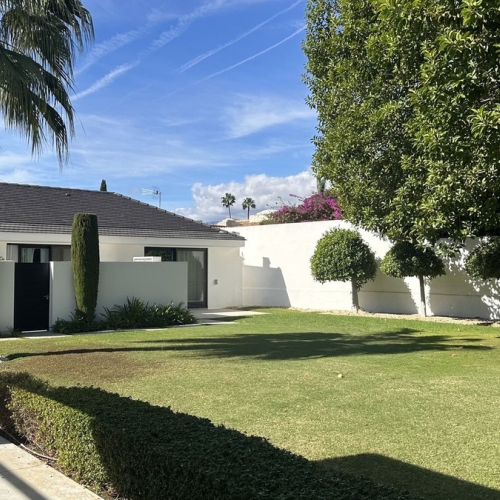 Beautiful villa in the Xarblanca area, close to all amenities and a 5-minute drive from the center of Marbella. It comprises a 1,100 m² plot with a very large garden surrounded by plants and palm trees throughout the house, and a large swimming pool. The house itself is 412 m² and is distributed as follows: