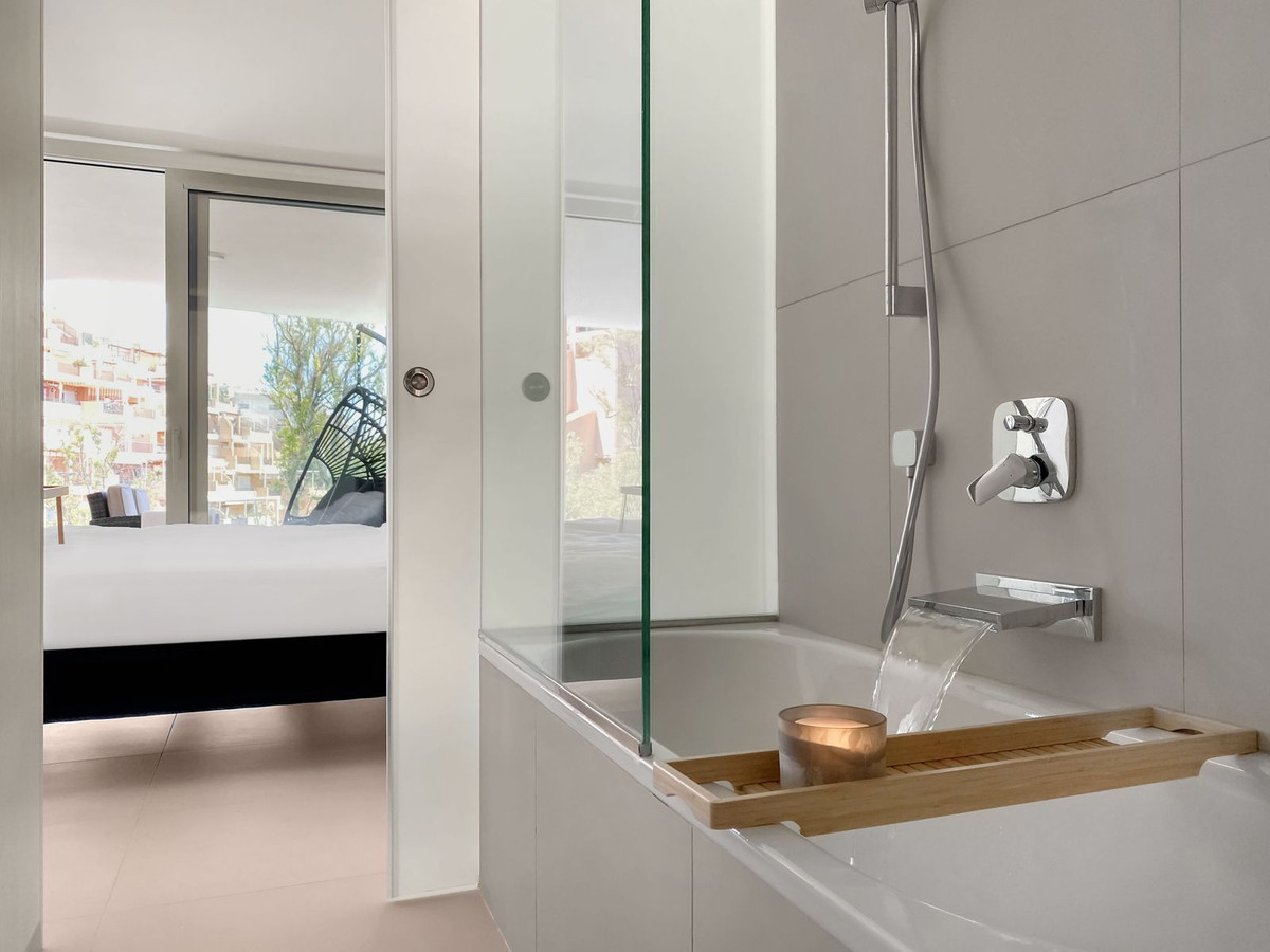 Oplev moderne strandliv i denne stilfulde lejlighed med 2 soveværelser og 2 badeværelser, beliggende i The Wave – et af de mest ikoniske og eksklusive boligkomplekser. Kun få skridt fra Carvajal-stranden og det prestigefyldte Higuerón Beach Club tilbyder denne nyere bolig et moderne design, høj komfort og en betagende panoramaudsigt over havet.