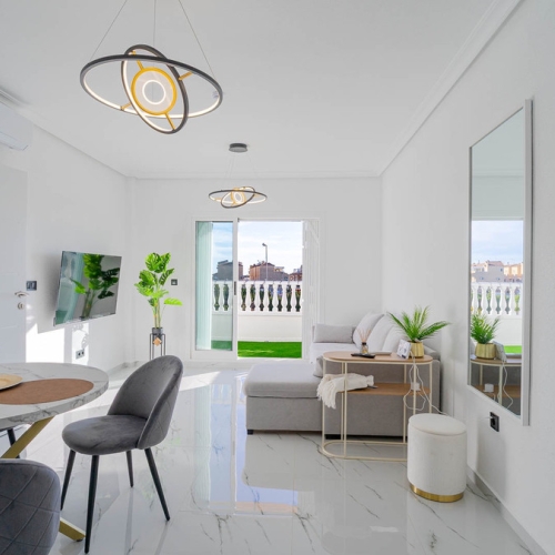 This South Facing, Two Bedroom, Top Floor, Apartment in Playa Flamenca is located in the heart of the ever-popular Orihuela Costa, just a short stroll from the Municipal Sports Ground and only a 10-minute walk to a selection of restaurants and café bars. The La Zenia Boulevard shopping centre, beautiful sandy beaches, and the Villamartin golf course can all be reached within a 5-minute drive, offering the perfect blend of convenience and coastal lifestyle on the Costa Blanca South. The property is accessed via a partly covered entrance terrace also boasting sun blind for shade, a lovely spot to relax and soak in the sunshine. Inside, the bright lounge/dining room leads to a separate arched fitted kitchen, two double bedrooms, including a master with built-in wardrobes, and a family bathroom. Internal stairs from the lounge lead to a first-floor room, ideal as an office/sitting area, which opens out to a private solarium — perfect for sunbathing or al fresco dining, also having a handy storage room. Residents have access to a nicely maintained communal pool area with a grass surround and the benefit of off-road parking. A fantastic opportunity for holidays, rental investment, or year-round living in a sought-after location on the Costa Blanca South.\n