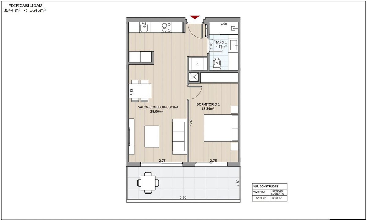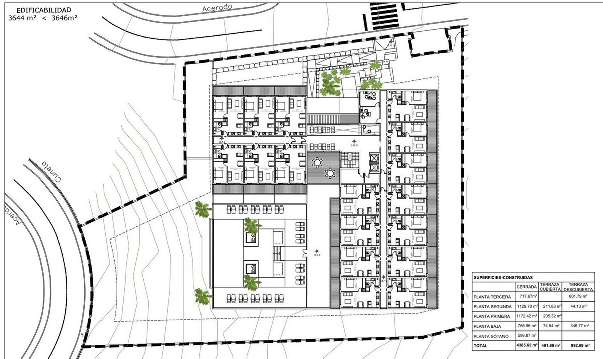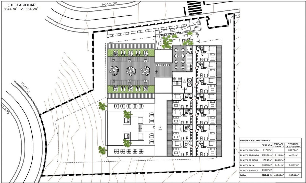 This is a plot designated for Equipment/Commercial use, with a total surface area of m² and 3,650 m² of buildable space, with a viable project for the construction of up to 51 tourist apartments.