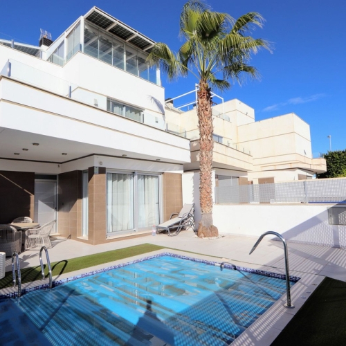 Beautiful and cozy villa located in one of the most beautiful areas of Orihuela Costa, in Dehesa de Campoamor. The house of about 200m2 built on the plot of almost 1500m2 is less than 900m from the beautiful beaches of Campoamor, within walking distance to the area where the tennis and paddle courts, the supermarket, the pharmacy, several bars and restaurants and other services are located. The villa built on the ground floor, we will find a total of 3 bedrooms and 2 bathrooms, the master bedroom with an en-suite bathroom and a large dressing room. Living room with fireplace, large independent kitchen, backyard with access to the laundry area and a nice front porch of about 20m2. In the well-kept and maintained garden we find a large private swimming pool (15x4) with a sliding transparent cover, a gym with a jacuzzi and a Finnish sauna, a wooden guest house with a small lounge, 2 bedrooms and a bathroom, and two other wooden houses, one with a bathroom that serves the garden and the swimming pool and a storage room. It also has a private garage for several vehicles and a barbecue area in the backyard of the house. It is sold furnished and equipped.