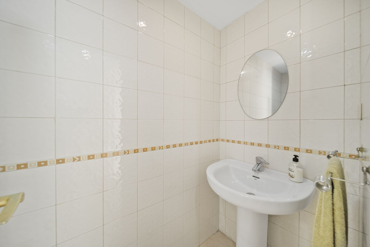 Enter via a gated entrance into a bright hallway leading to a spacious living-dining area that opens onto a large terrace with toldos (awnings) — perfect for alfresco dining or sunbathing. The terrace allows direct access to the communal gardens and pool.