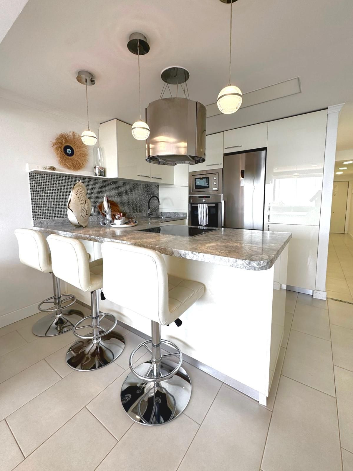 With panoramic sea views from the living room, this beautifully renovated apartment features a master suite bedroom, an additional full bathroom, and an inviting living area with sofa beds. The open American kitchen blends seamlessly into the space, ideal for relaxed mornings or entertaining friends.