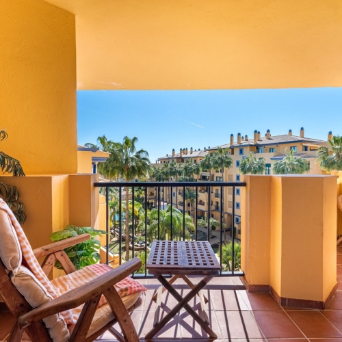 Spectacular apartment with 3 bedrooms, 2 bathrooms and 125m2 of interior, located on the 1st floor, facing east. Furnished and decorated with attention to detail, the property consists of an entrance hall, a spacious living-dining room with access to a fantastic covered terrace of 10m2 with views of the mountains and the gardens of the urbanization. 3 bright bedrooms (one of them ¨en-suite¨), with fitted wardrobes and double glazed windows, second bathroom and a separate and fully equipped kitchen. Marble floors, hot and cold air conditioning, television and internet installation.