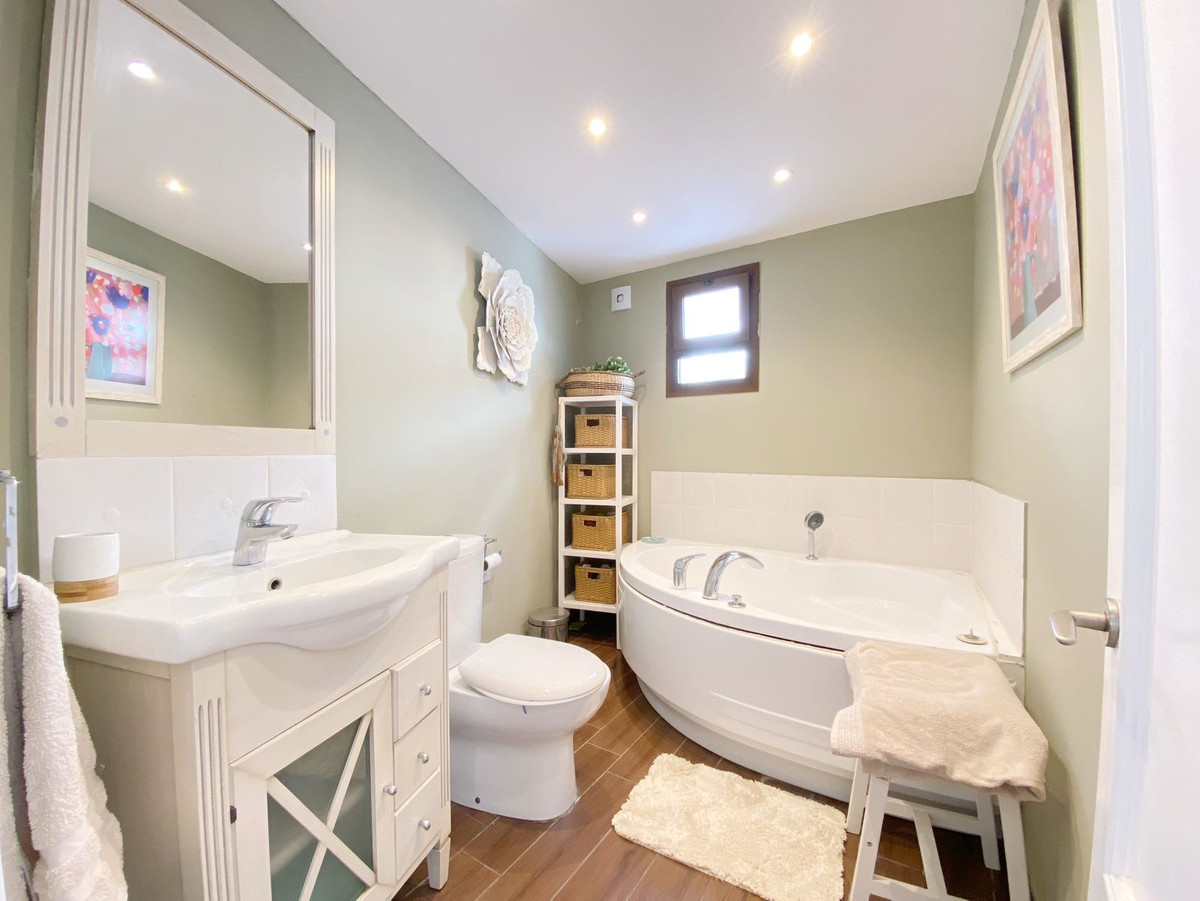 On the main floor, there is a cozy living and dining room, a kitchen with an island, and a beautiful central interior courtyard. There are also 3 spacious bedrooms and 2 bathrooms. The master bedroom has an en-suite bathroom.