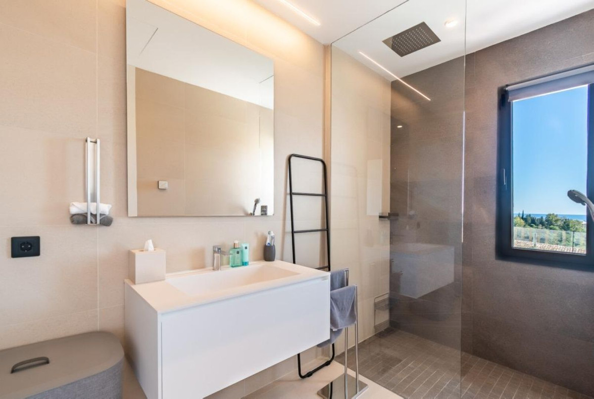 The villa features four spacious double bedrooms, each designed with sophistication, and four fully equipped bathrooms finished with high-end materials. The interiors are bright and airy, enhanced by large floor-to-ceiling windows that offer breathtaking views of the Mediterranean Sea and surrounding mountains.