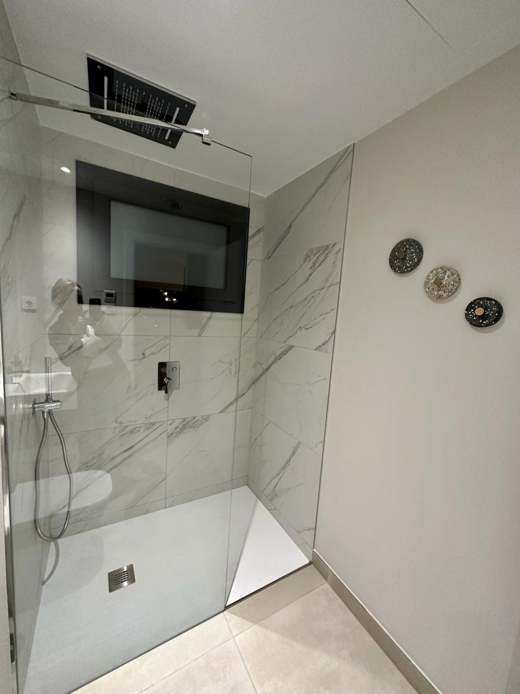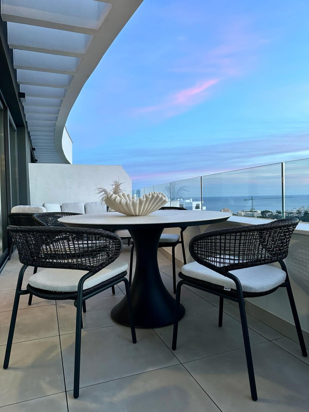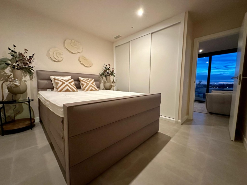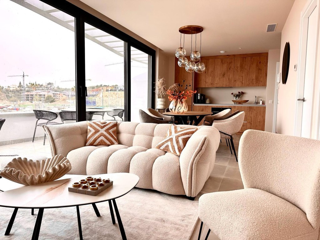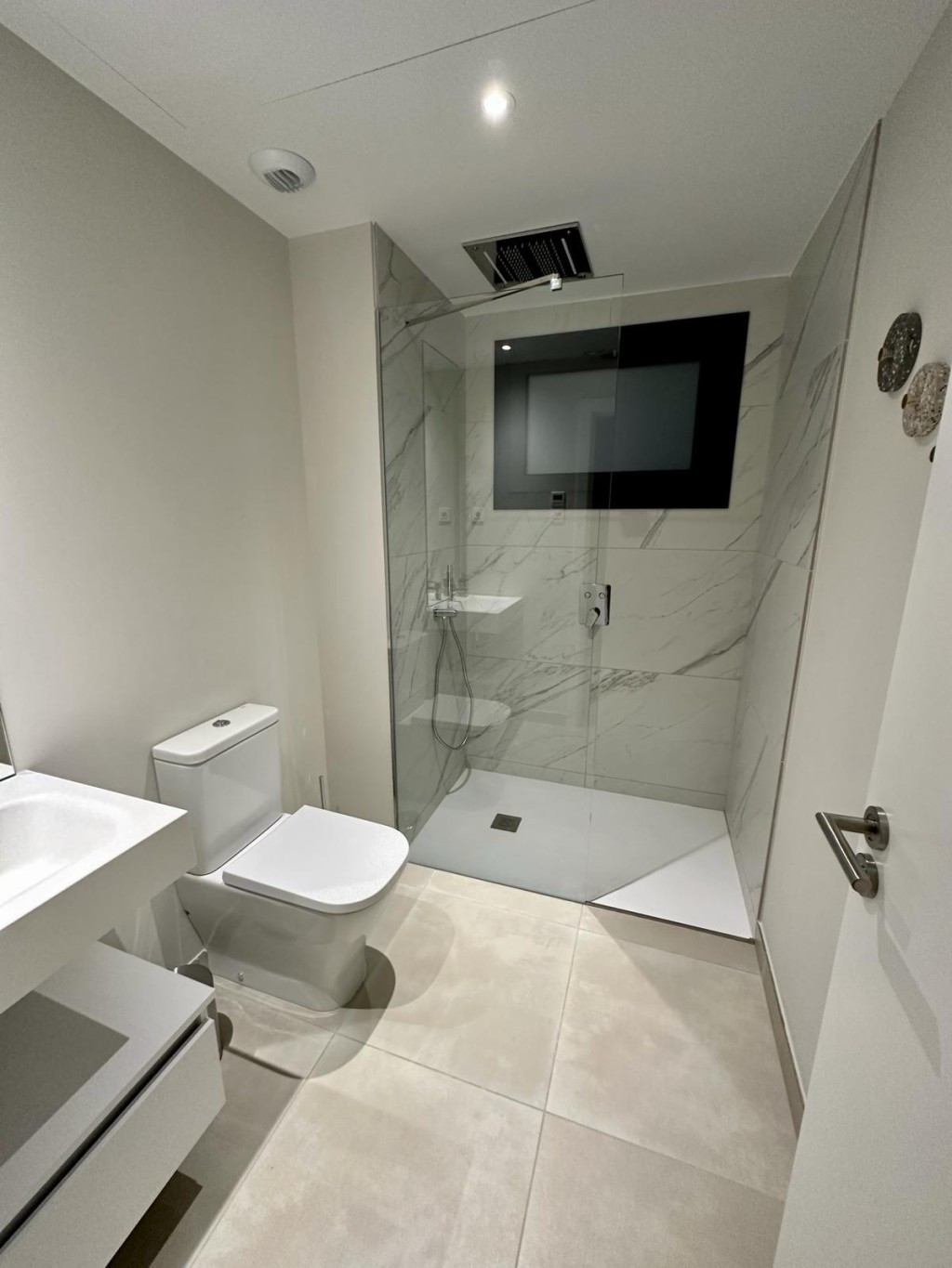 New built modern style penthouse in El Higueron en Fuengirola with two bedrooms and one bathroom, open plan kitchen, living room and with stunning terrace with panoramic sea views, sold furnished with quality furniture and including an exterior parking space, an underground parking space and a storage room. Air conditioning hot and cold via aerothermia, electric blinds in the living room, dim switches in all rooms, tv and internet connections in the living and bedrooms, underfloor heating and special tiles and rain shower in the bathroom. Gated complex with pools and facilities. The beach is a 15 minute walk away.