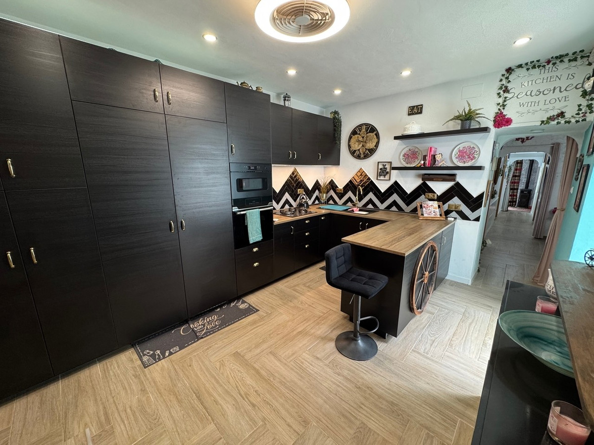 Inside, the ground floor layout is both practical and inviting. There are three well-proportioned bedrooms, a cozy snug complete with a traditional fireplace for cooler evenings, and a separate dining room that offers a warm and welcoming space for family meals or entertaining guests. The beautifully renovated kitchen has been tastefully updated, combining rustic charm with modern functionality. An internal courtyard brings natural light into the center of the home and provides a private outdoor retreat. The bathroom, also located on the ground floor, is comfortably fitted and conveniently positioned with the toilet being in a separate space.