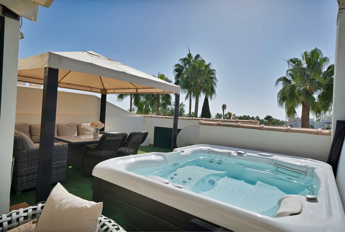 With over 300 m² built area, the property features 3 bedrooms, 2 bathrooms, and a guest toilet. The generous living and dining area opens onto a west-facing terrace overlooking the communal gardens and pool. The bright, fully equipped kitchen complements the home's spacious layout, while the private rooftop solarium — complete with a jacuzzi — provides the perfect spot to relax and enjoy panoramic views.
