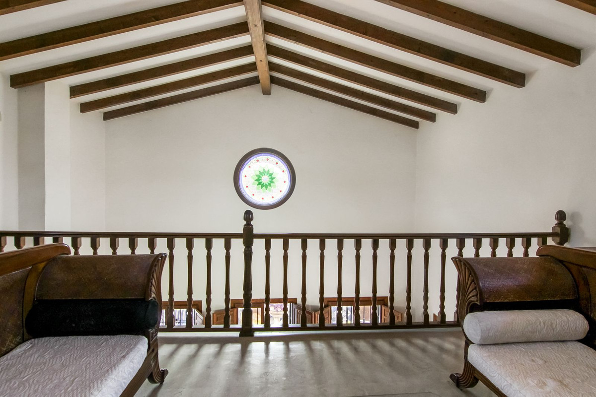 Living room is breathtaking, very spacious with high ceiling and big fireplace. Rustic style beautiful wooden framed windows, and indoor shutters, views to the countryside. There is plenty of natural light and access to the outdoor courtyard, from where you can also access the terrace. There is a potential and space to make overground pool. A lot of options for this idea.