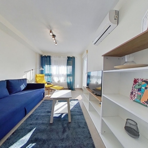 The bedroom is in a quiet location and has a pleasant amount of light. There is space for a double bed and bedside tables. The bedroom also has its own exit to the large patio.
