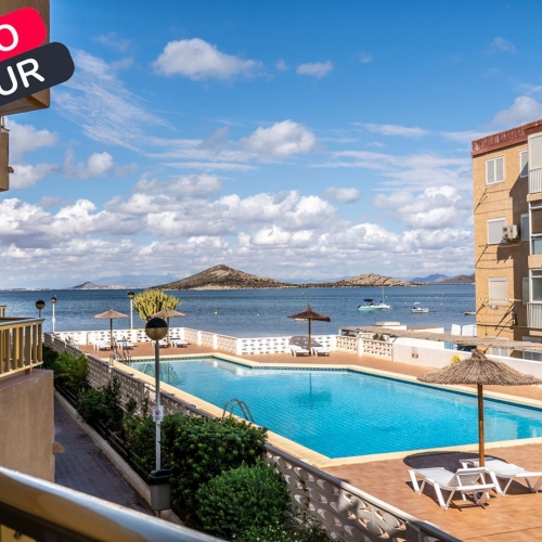 Modern and beachfront apartment with large terrace and shared pool A warm welcome to this charming and homely ground floor apartment with an inviting feel and generous light flow located in attractive La Manga. Here you live with views of Playa Veneziola, the Mar Menor and the mountains, as well as being close to shops and restaurants.