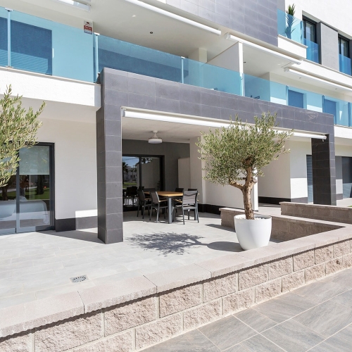 Bathed in natural light, the spacious open-plan living room and kitchen boasts a feature, curved ceiling and a fully equipped kitchen complete with a breakfast bar, perfect for casual dining. The lounge opens directly onto your own private south-facing terrace. From here, there are breathtaking views of the mountains. A perfect spot to unwind and enjoy the tranquility.