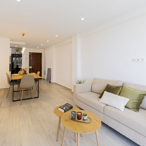 The layout includes a comfortable living and dining area, a compact kitchen, one bathroom, and a main bedroom. A section of the terrace has been enclosed and is currently used as a practical guest room, providing extra sleeping space or an ideal spot to work from home.
