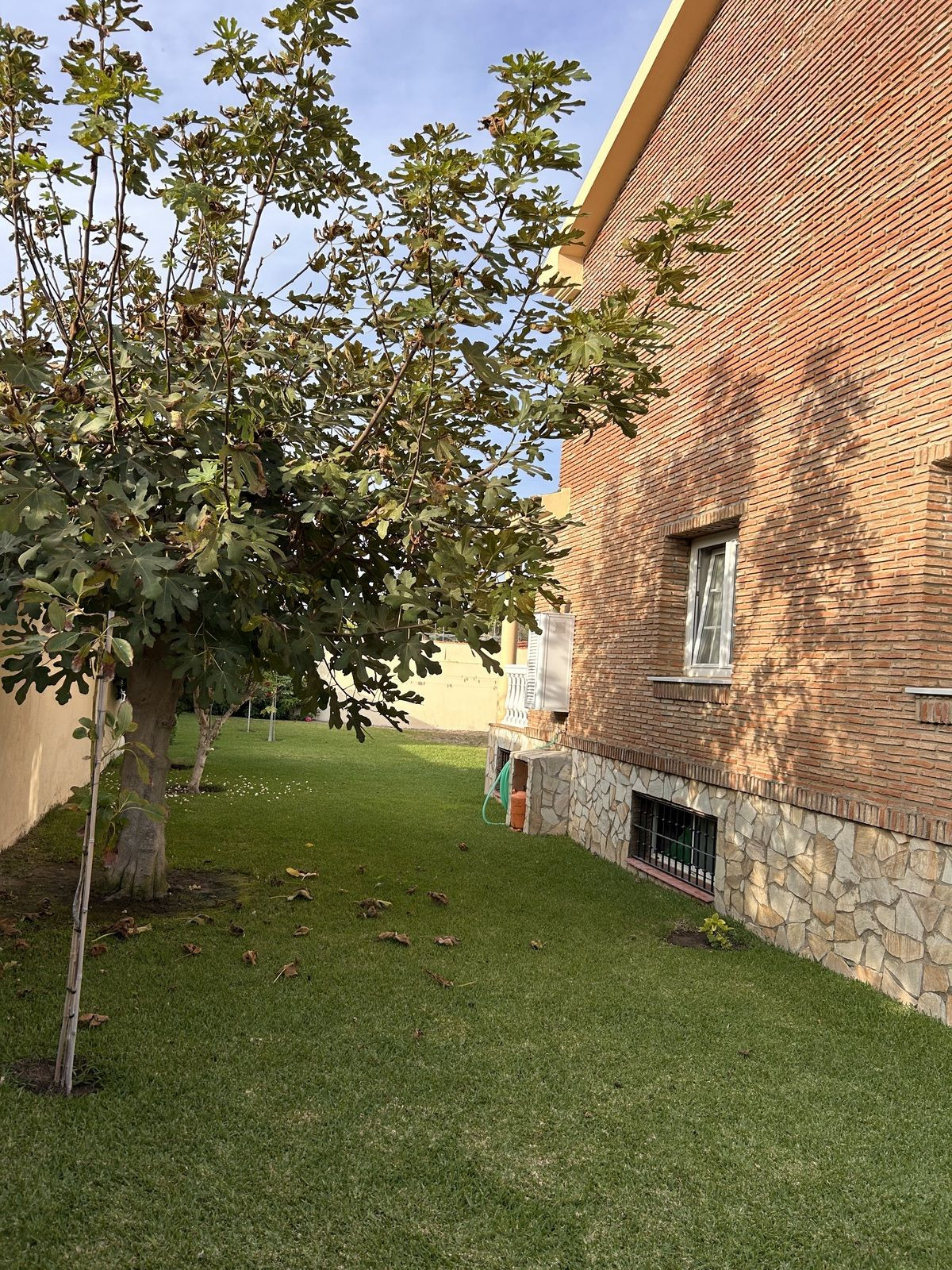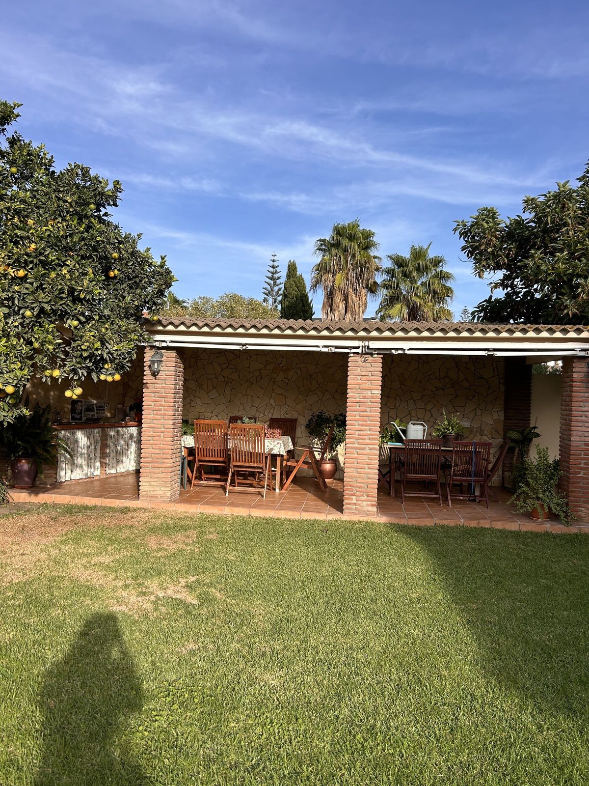 The property is surrounded by a large garden with fruit trees, creating a peaceful and private atmosphere. The outdoor dining area is perfect for gatherings with family and friends.