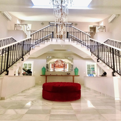 A south-facing single-level villa with 265 m² built and 110 m² of terraces, featuring 3 spacious bedrooms plus guest accommodation with an ensuite, 4 bathrooms, a private garage, and mature gardens. With ample outdoor space, it's ideal for adding a new pool and modernizing into a contemporary residence.