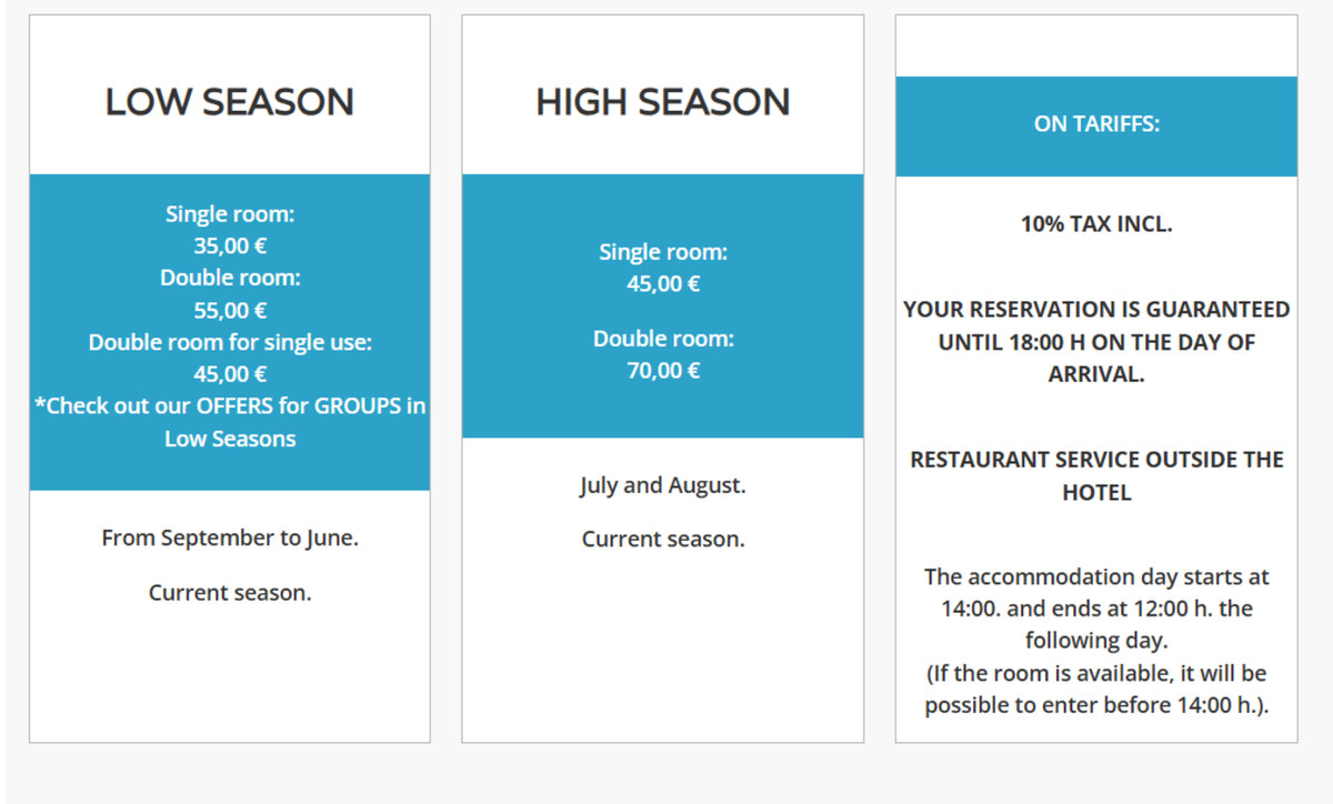 The hotel has a restaurant (external service of the hotel) and has 16 rooms spread over two floors, which gives it a cosy and homely atmosphere. It has 10 exterior double rooms (8 of which have sea views and en-suite bathrooms with walk-in showers) and 6 single rooms.