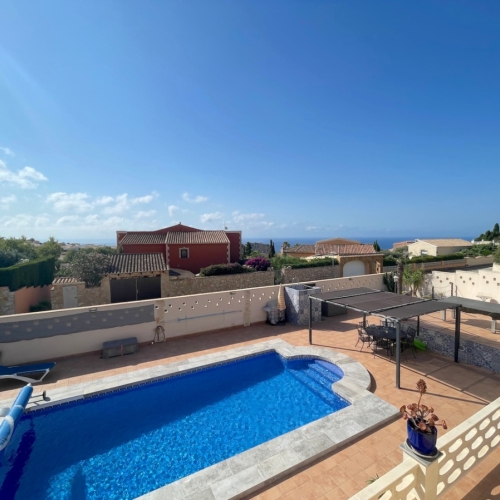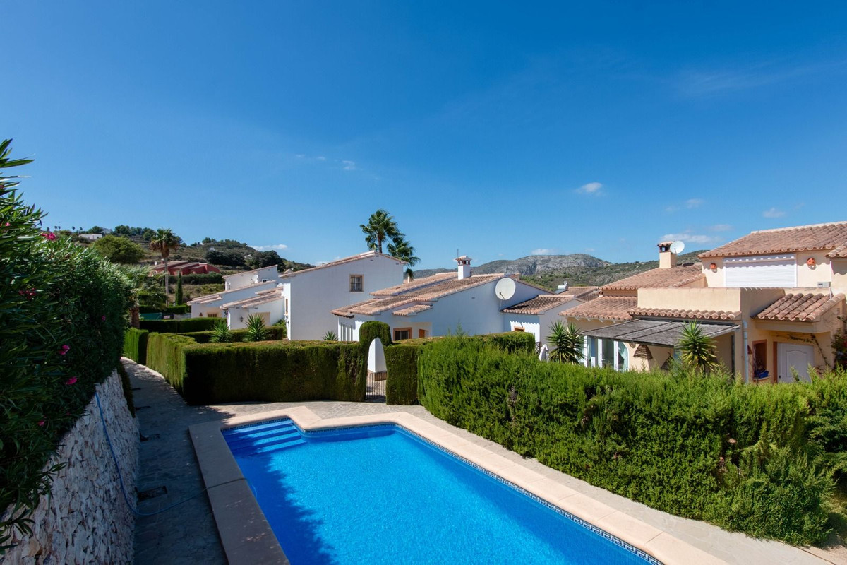 Villa for sale in Benitachell<p class="ql-align-justify">Villa on one level with communal pool shared between four villas. </p><p class="ql-align-justify">From the designated parking area at road level, 10 steps lead down to the villa which has an enclosed private garden. </p><p class="ql-align-justify">The property comprises: open plan lounge-diner with open kitchen, master bedroom with ensuite bathroom, a double guest bedroom and a family shower room. Both bedrooms have fitted wardrobes. Off of the lounge there is a glazed terrace that opens out to the private garden area with the communal pool close by. </p><p class="ql-align-justify">Outside the garden areas are mainly to the front of the property, but also at the sides and back with several storage areas. </p><p class="ql-align-justify">The property benefits from UPVC windows and doors throughout and mains gas central heating. Community fees are split into three payments of 132€, payable May, July and October.</p><p class="ql-align-justify">Located in the sought after area of Los Molinos, just a short drive away from Benitachell town and 15 minutes drive from both Moraira and Javea.</p><p class="ql-align-justify">To arrange to view this villa for sale in Benitachell, please contact Sunshine Villas, your estate agent in Benitachell, Costa Blanca.</p