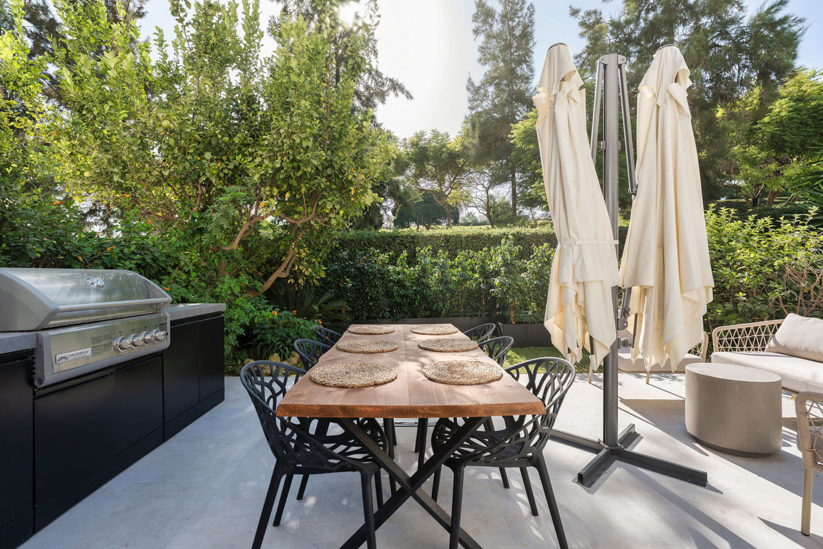 The terrace extends the living space outdoors, creating a natural transition ideal for relaxation and entertaining. With dedicated areas for lounging and dining, including a built-in barbecue, this space invites al fresco meals with stunning sunset views and the peaceful backdrop of the golf course's greenery. The kitchen, fitted with Siemens appliances, is sleek and minimalist, designed to maximize efficiency without compromising on aesthetics.