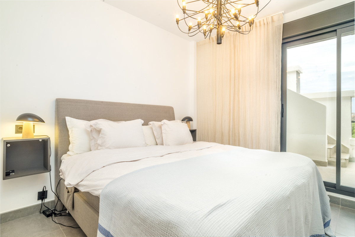 The interior follows a contemporary Scandinavian style, defined by clean lines, bright spaces, and high-quality finishes. The open-plan kitchen, equipped with Siemens appliances, integrates perfectly with the dining and living areas, creating a fluid layout suited for both relaxed living and entertaining. Large sliding doors lead to the west-facing terrace, where residents can enjoy panoramic views over the Los Arqueros golf course and surrounding mountain landscape. From here, sunsets are particularly striking, making evenings on the terrace a highlight of the property.