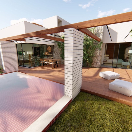 To one side, the spacious and cosy master bedroom offers a direct view of the garden, inviting rest and serenity. Nearby is a full bathroom that combines design and practicality. The hallway leads to a second bedroom, perfect for guests or family, and an additional bathroom.