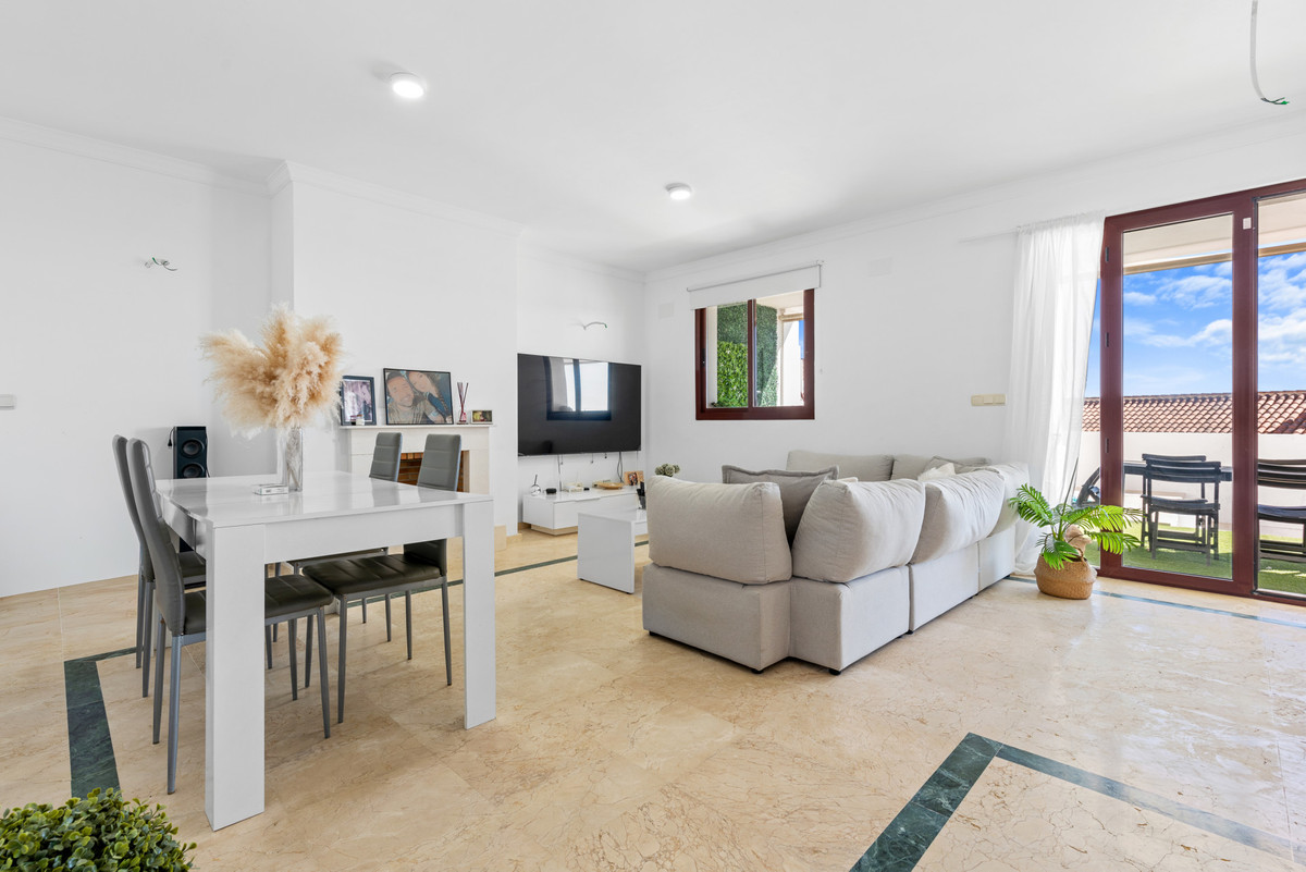 Den primære opholdsstue er designet med en åben planløsning, der kombinerer et moderne køkken med stue og spiseplads. Store franske døre forbinder det indre med de udvendige terrasser. Terrassen i stueetagen har en privat dyb pool.