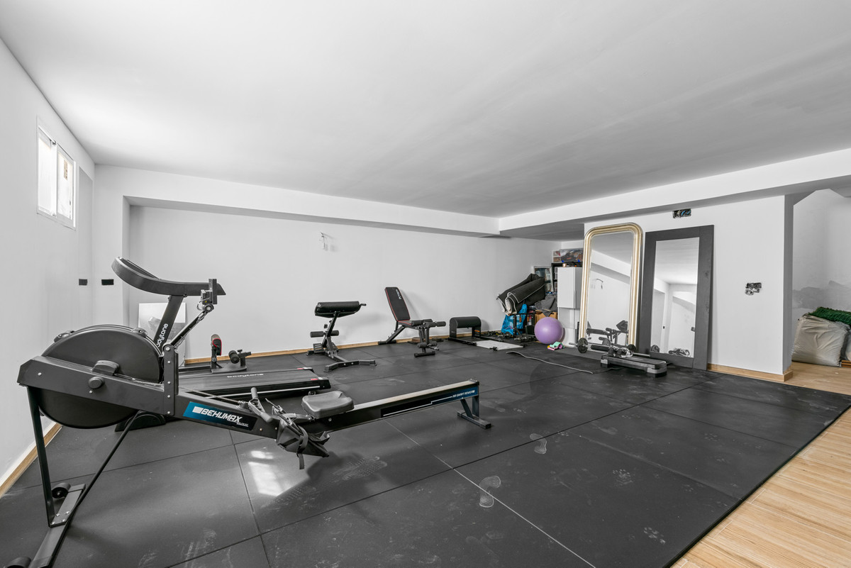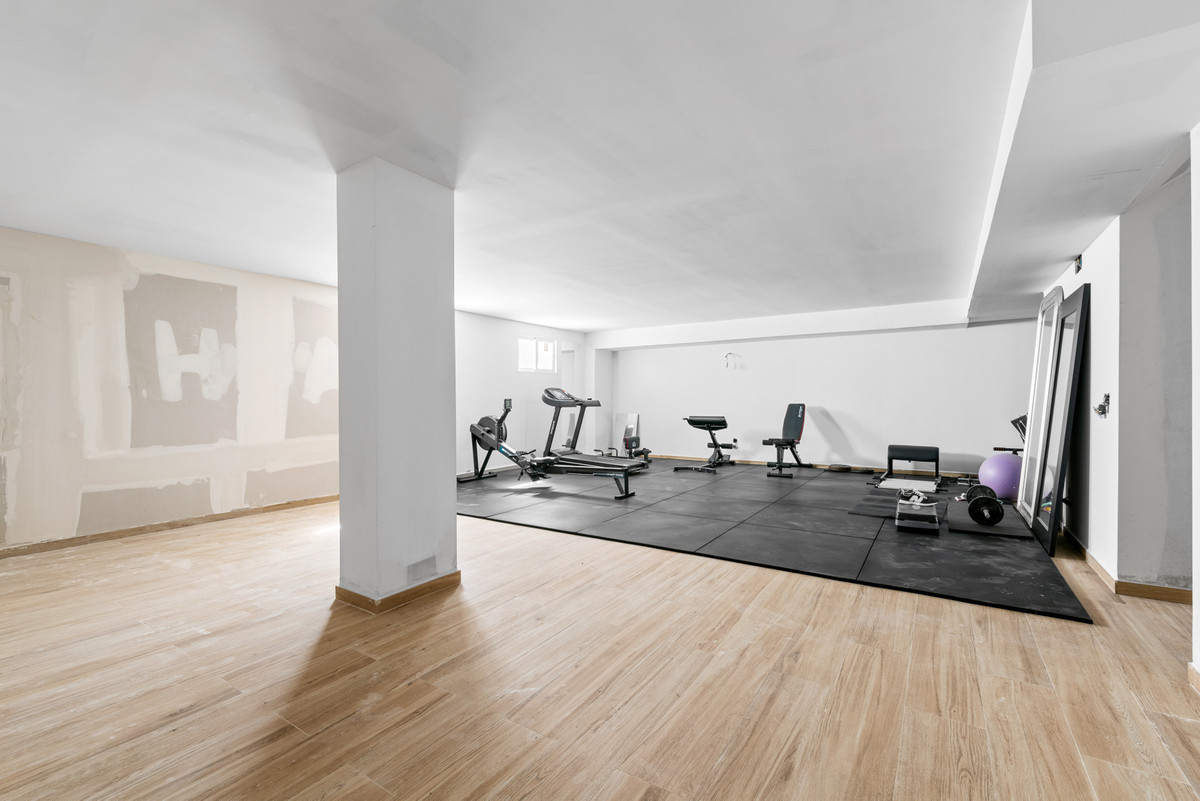 På det nederste niveau er der en stor kælder, der er indrettet med fitnessrum og badeværelse, men som kan omdannes til ekstra soveværelser eller andre formål, hvis det ønskes.