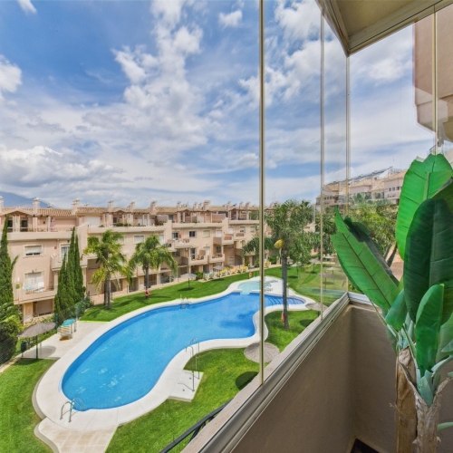 I Manilva kombinerer denne elegante 3-værelses lejlighed i stueplan komfort, stil og en uovertruffen beliggenhed. Beliggende i gåafstand fra stranden, skoler, supermarkeder og alle faciliteter, tilbyder den også hurtig adgang til Sabinillas, Puerto de la Duquesa, Estepona og Gibraltar. Den fuldt møblerede og indflytningsklare lejlighed har et bebygget areal på 107 m² og en fremragende sydøstlig orientering, der giver naturligt lys hele dagen. Den har en rummelig stue-spisestue med direkte adgang til en stor 47 m² terrasse med en overdækket veranda, perfekt til afslapning eller hyggelige udendørs sammenkomster. Den har også et fuldt udstyret køkken, tre soveværelser (et med eget badeværelse) og to komplette badeværelser. Den inkluderer en overdækket parkeringsplads, et opbevaringsrum og central aircondition. Komplekset tilbyder flere fælles pools, store tropiske haver og private og fredelige omgivelser, ideelt til helårsbeboelse eller ferieboliger. En upåklagelig ejendom, der skiller sig ud med sin elegance, komfort og fremragende beliggenhed på Costa del Sol. VI ANBEFALER ET BESØG!